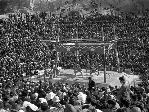 時津風一行156人による大相撲に、相撲場開設以来の大観衆。入場観衆は2万人を超えた。 -